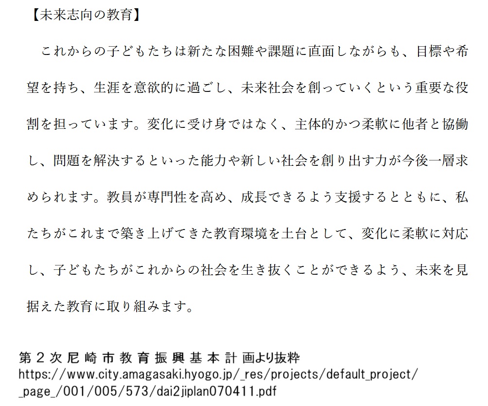 後に記載するアンケート資料からは、尼崎市教育員会が掲げる教育問題に対する意識と、教育現場で指導に当たる教職員の問題意識に、大きな差があり、それらが改善されていく方向にはなってないのではないかという懸念を感じました。