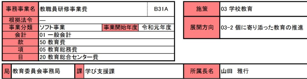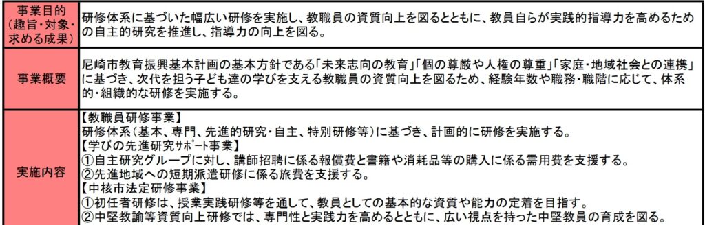 今回は学校教育関係事業な中でも、教職員を対象にした教職員研修事業費です。令和元年度から開始された事業であり、教員の指導力向上を目的にしているとあります。