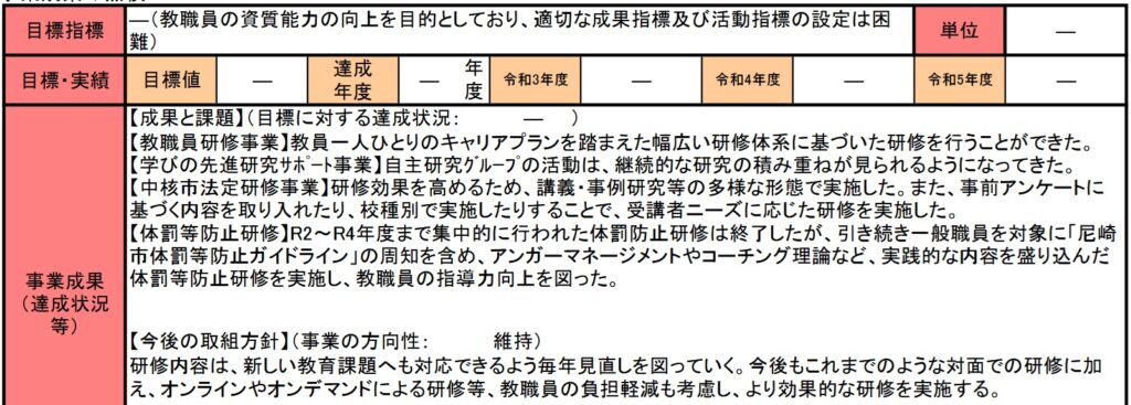 事業成果には、研修を受けた教職員の感想や、アンケート結果にすら言及されておらず、本当に教職員の指導力向上になったのか、まったく判断ができない状態です。