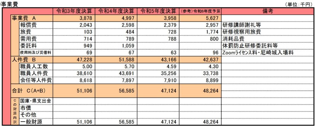 この事業の事業費を見ると、研修講師の謝礼や、視察用旅費に交じって、「尼崎城入場料」と記載されており、ただの慰安旅行ではないだろうかという疑念が芽生えてしまいました。