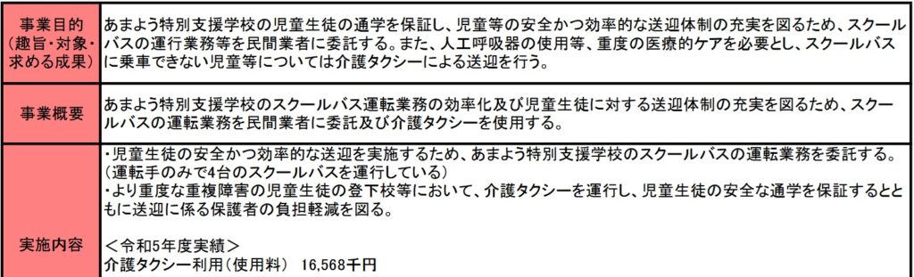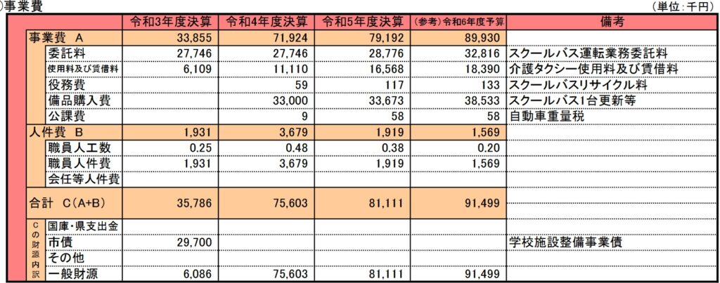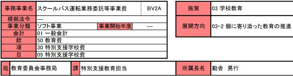 今回は学校教育関連事業のうち、特別支援学校の児童生徒たちの為の、スクールバス運転事業委託等事業費についてです。この事業も開始年度の記載はありません。