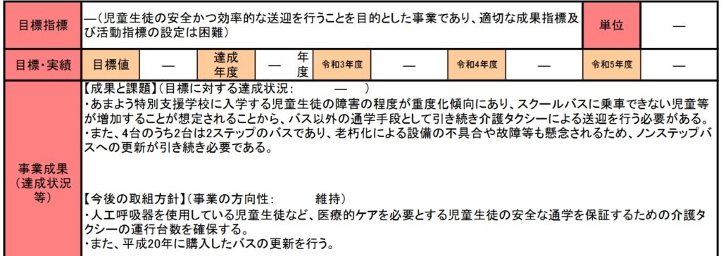 この事業の目標指標は例によって、数値的な記載はなく、事業成果にはただ継続します、新し送迎バスを買います、との記載しかありません。