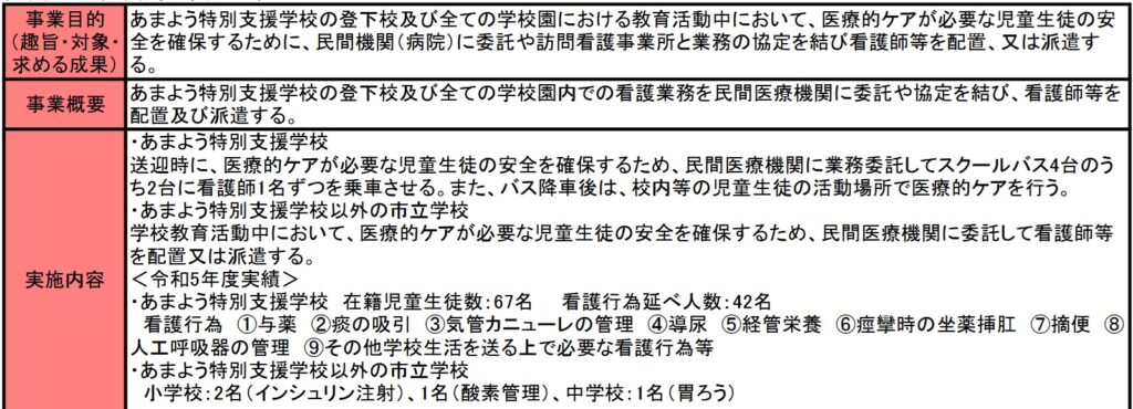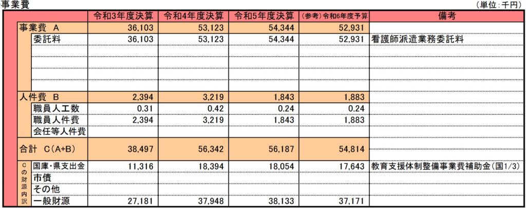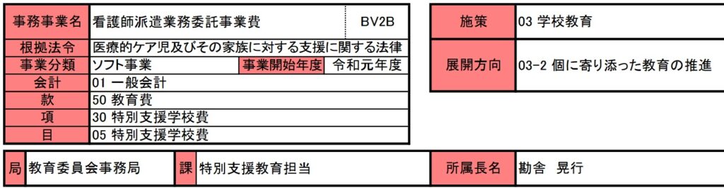 今回は前回投稿したスクールバス運転業務委託等事業費などにも関係する、児童生徒たちへの医療ケアを行う、看護師派遣を行うための事業費についてです。令和元年度から実施された看護師派遣業務委託事業費について見ていきます。