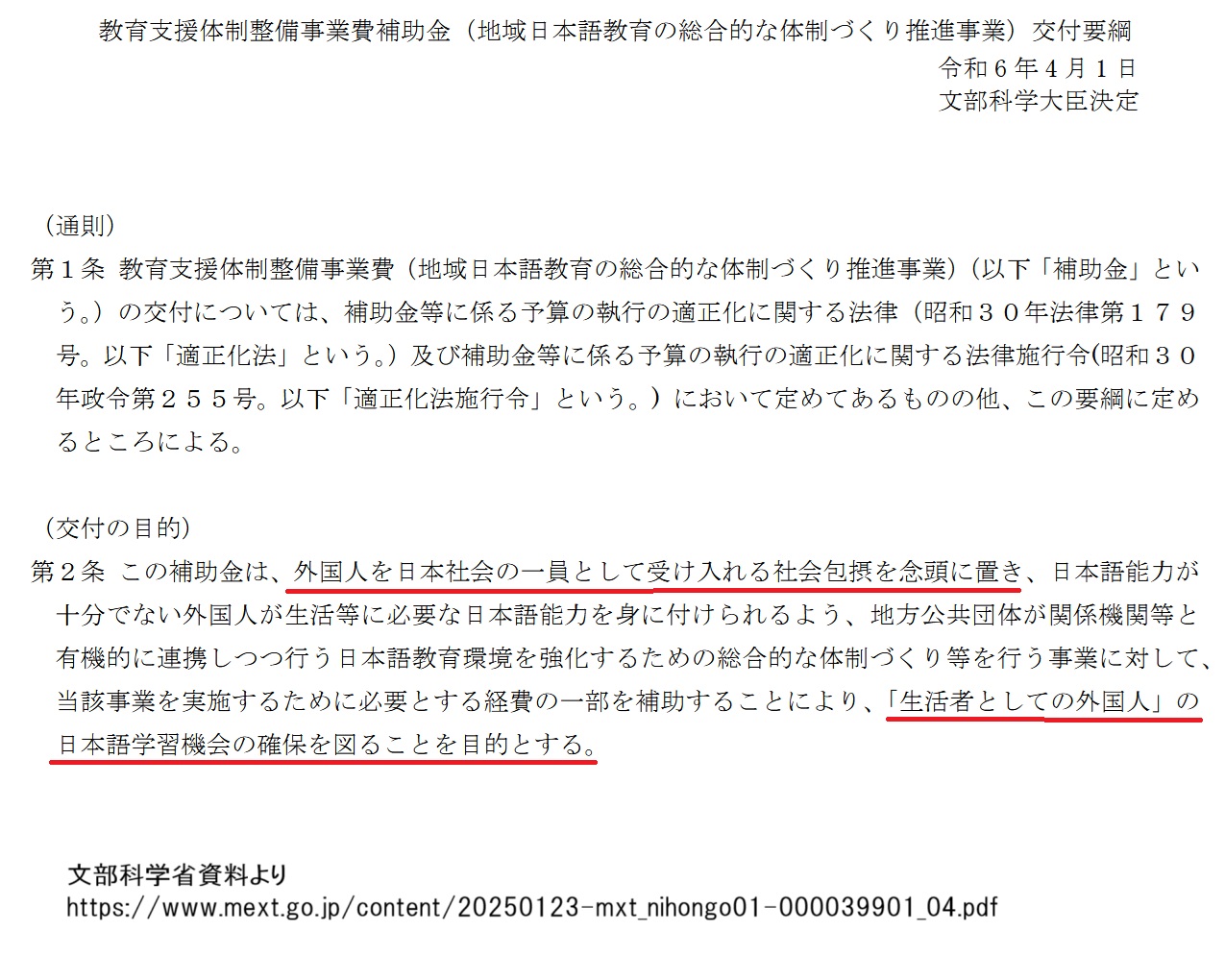そして何より、この事業で避難されるべきは、今回も「教育支援体制整備事業費補助金」が使われていることです。これは以前投稿した特別支援教育サポートシステム事業費・心の教育相談事業費・不登校対策事業費でも指摘しましたが、本来は外国人への生活支援を目的にした補助金です。