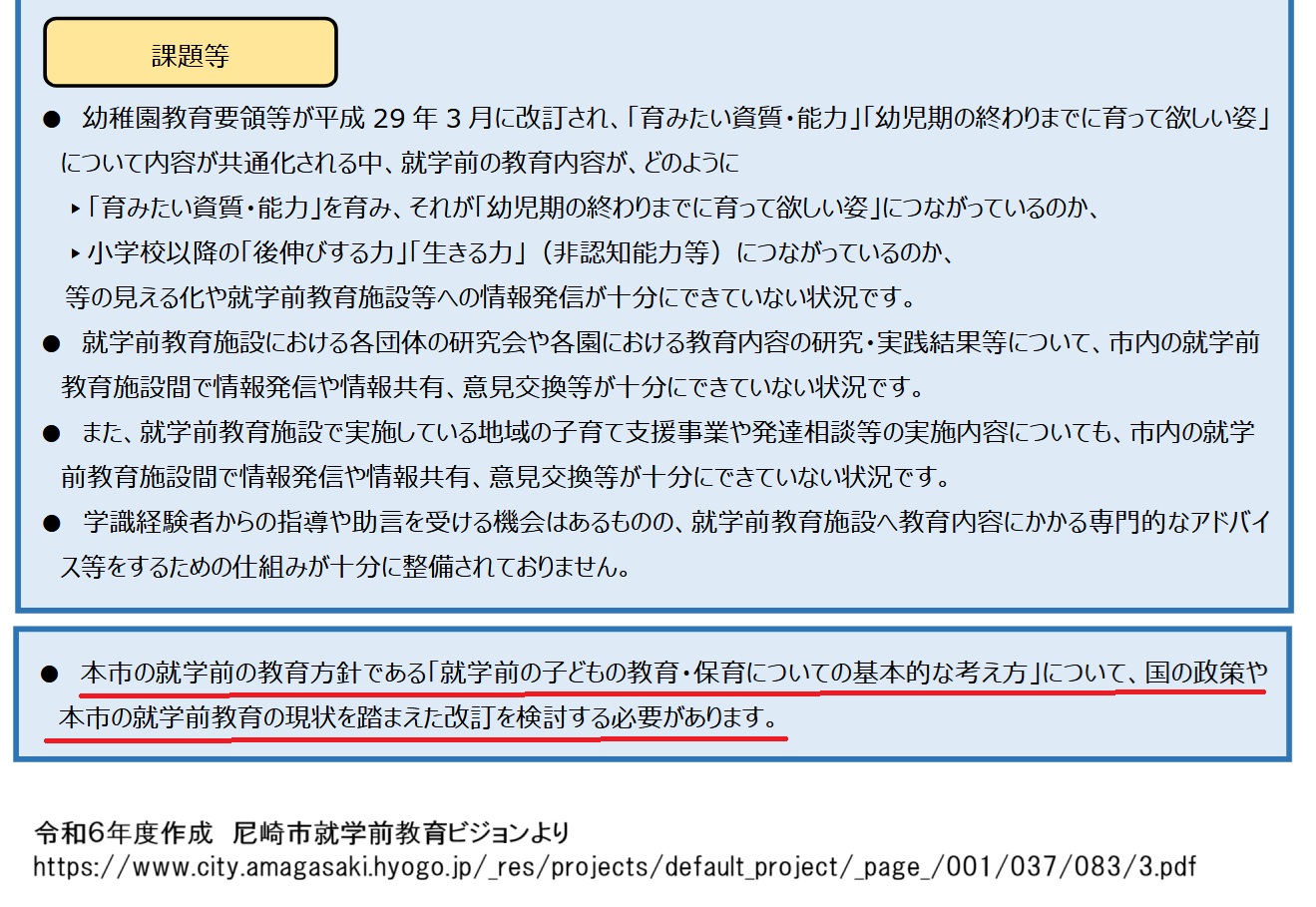冒頭には尼崎市就学前教育ビジョンで書かれていた、尼崎市の就学前教育についての課題を掲載しました。その中で「就学前教育の現状を踏まえた改訂を検討する必要があります」と報告されていました。