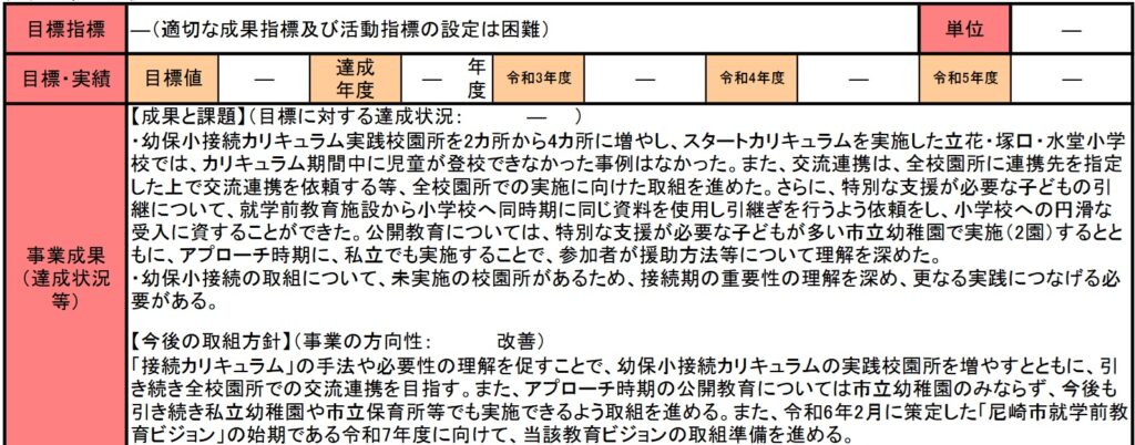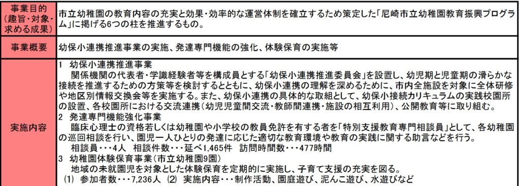 尼崎市が平成24年度から掲げて、平成28年度から段階的に実施していた尼崎市立幼稚園教育振興プログラムやその後、令和6年2月に作られた尼崎市就学前教育ビジョンを見ても、この事業が成功したとは言えず、以前の取組に対する反省もなく、検証するデータすら持っていない現状がよくわかります。
