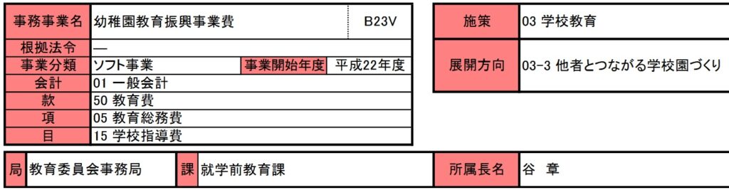 今回は幼稚園に通う園児やその家庭を対象にした、幼稚園教育振興事業費についてです。平成22年度から開始されていますが、年々子供の出生数が減っているのに、”振興”とはこれ如何に。