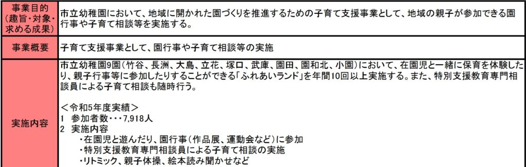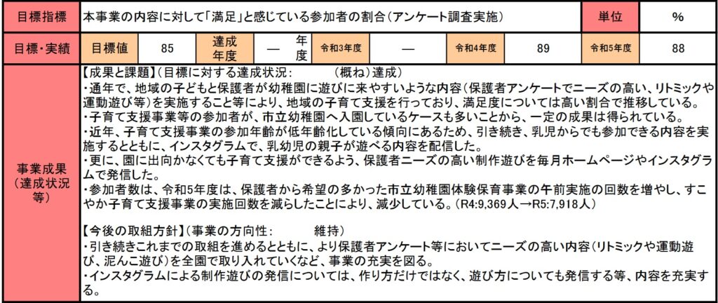 事業成果では、保護者からの希望が多かった市立幼稚園体験保育事業の午前実施の回数を増やし、すこやか子育て支援事業の実施回数を減らした。とあります。その結果イベント参加人数は前年度より減少したと記載されています。
