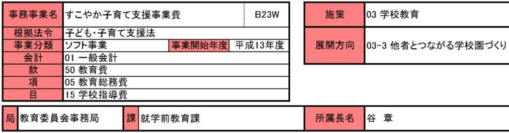 今回は子育て支援関連事業についてです。すこやか子育て支援事業費は平成13年度から開始されており、市立幼稚園での地域在住の子育て世帯を対象にした、親子参加型のイベントや子育て相談を実施している事業です。