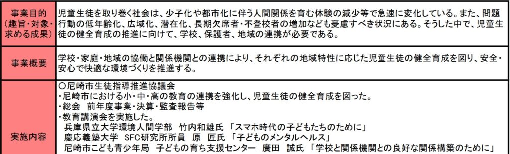 事業内容は、尼崎市生徒指導推進協議会という市内の協議会が中心となって、小・中・高の教育連携を図って、子供たちの健全育成を推進しるとあります。