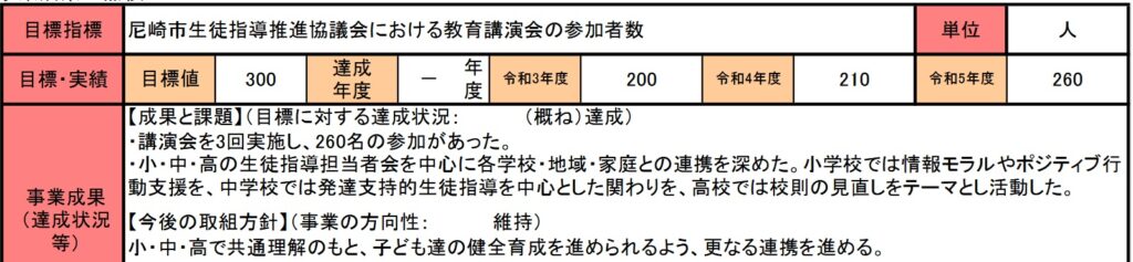子供たちの健全育成に貢献しているというのであれば、せめて尼崎市市内の非行少年等の概況を調べて、それらの減少率を目標にするなどの変更は必要でしょう。