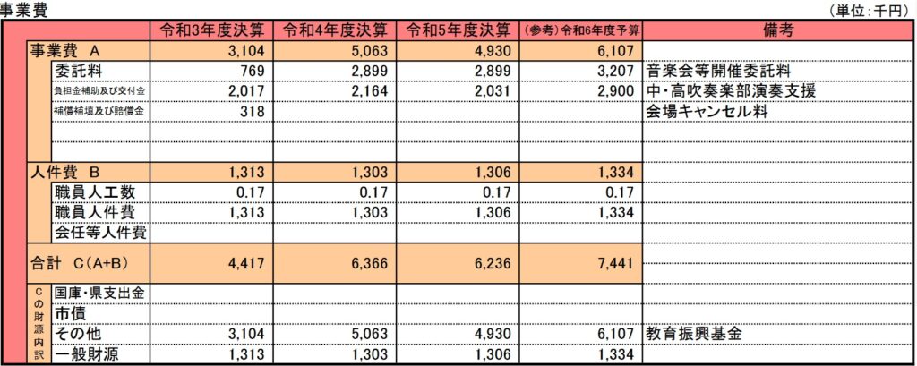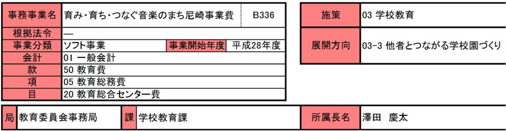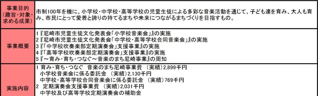 育み・育ち・つなぐ音楽のまち尼崎事業費は平成28年度から開始された事業費です。事業目的には「未来につながるまちづくりを目指す」とありますが、その事業的な事業内容は、小・中・高の定期音楽会の開催費用です。その費用も、市民の寄付によって行われており、正直尼崎市ではなく、尼崎市が支援していた市民団体(文化団体育成助成金)や、文化財保存活用地域計画策定事業費・文化芸術推進事業費でこそ行うべき内容とは思いました。