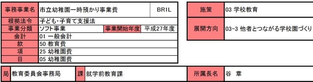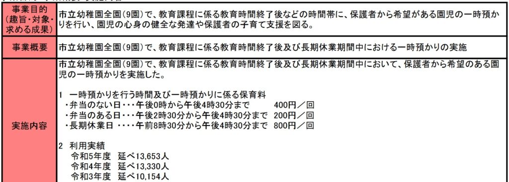 市立幼稚園一時預かり事業費は平成27年度から開始された事業で、文字通り市立の幼稚園にて、教育時間外に園児を預かる事業です。いまや現役世代は、共働き家庭がほとんどを占める時代です。その中で子育てのしやすさは、生活圏に子どもを預けられる場所の有無が、大きく関係してくる状況です。