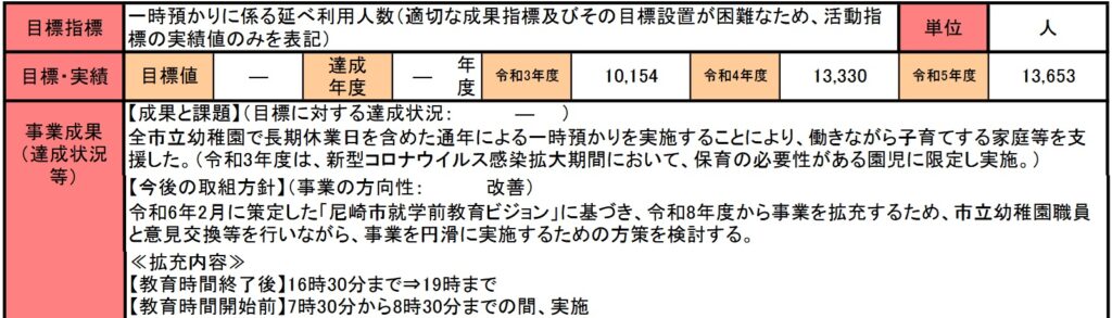 実際に尼崎市の尼崎市就学前教育ビジョンには、0~5歳児の就学前児童の数自体は、減少していくものの、保育需要は、共働き家庭の増加により、逆に増加していくと予想しています。それを踏まえて、尼崎市でも今後、この事業内容も改善していくと、事業成果には記載されています。