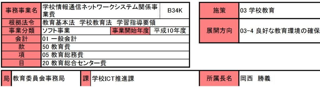 学校情報通信ネットワークシステム関係事業費は平成10年度開始の事業で、現在は文部科学省が推進しているGIGAスクール構想を請け負う形で実施されています。