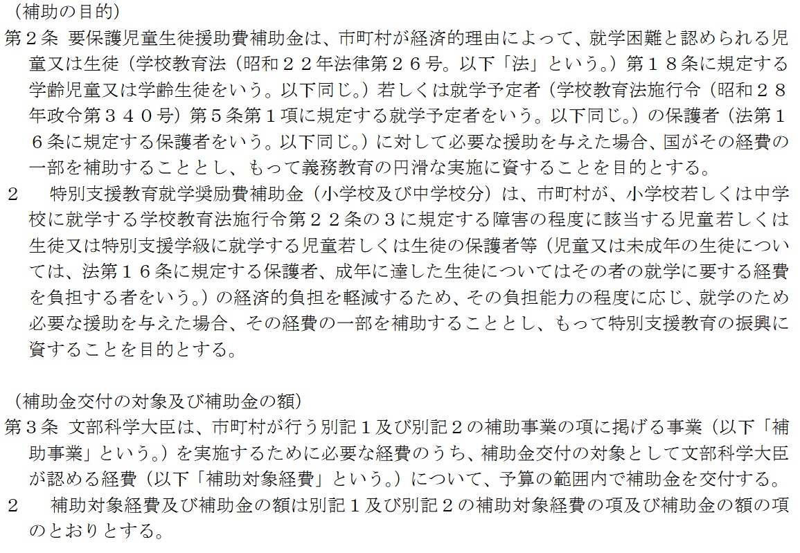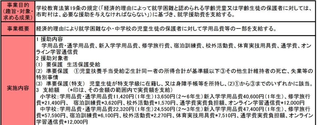 学校教育法第19条において、「経済的理由によって、就学困難と認められる学齢児童生徒の保護者に対しては、市町村は、必要な援助を与えなければならない。」とされていることから、国や市区町村は要保護・準要保護児童生徒に対して、下記の補助対象項目について援助を行っています。