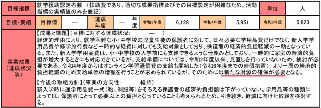 事業成果によると、令和4年度からはオンライン学習通信費が新たに支給対象に加えられたことから、財財政的負担が増加して、新たな財源がいるということです。
