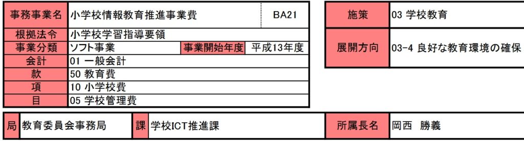 この事業内容と似たような事業は行われており、重複するような事業内容であれば早く廃止するべきでしょう。教育ICT環境整備事業費・学校情報通信ネットワークシステム関係事業費がそれらに当たります。