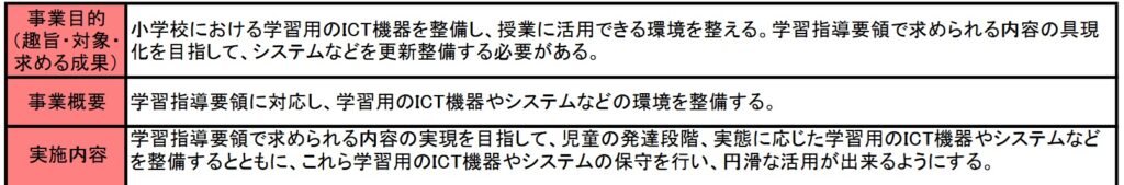 この事業の概要では、「学習用のICT機器のシステムなどの環境を整備する」とあり、これはまさに先ほど書いた教育ICT環境整備事業費・学校情報通信ネットワークシステム関係事業費で行っている内容です。