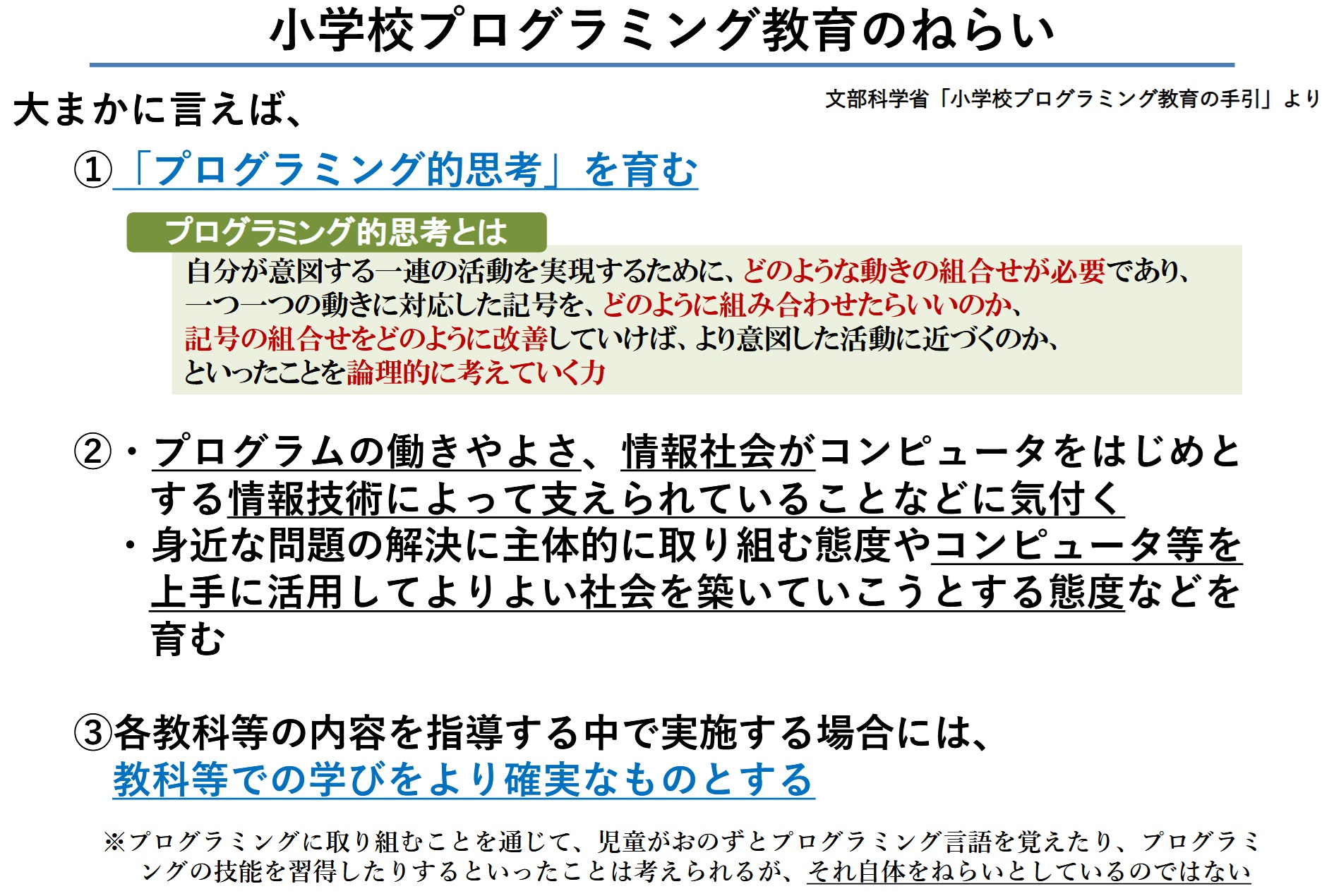極めつけはこの事業の成果についてです。文部科学省の情報では現在のところ一応の「情報教育」という項目があり、その中で小学校でどの程度の学習をする、という目安はあるようですが、やはり実際の教育現場ではまだそこまでの認識の共有は進んでいないようです。