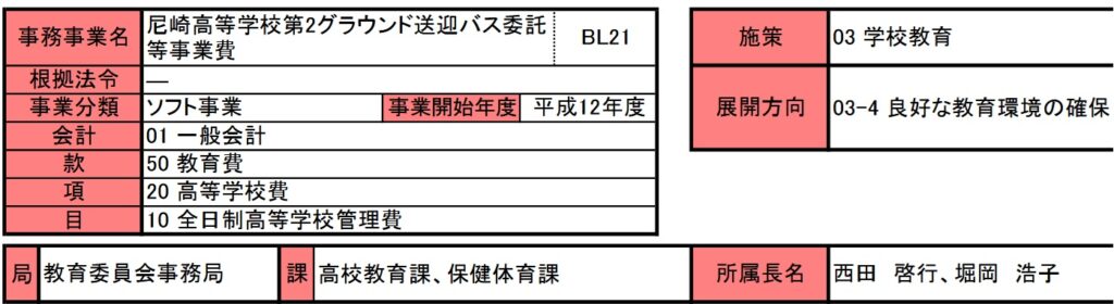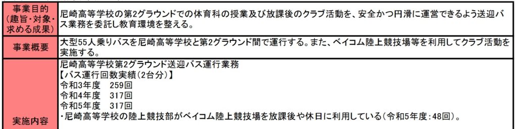 尼崎港高等学校第2グラウンド送迎バス委託等事業費は平成12年度開始の事業です。事業内容は尼崎市立尼崎高等学校の生徒を、第2グランド又はベイコム総合運動公園まで送迎する、送迎バスの委託事業です。