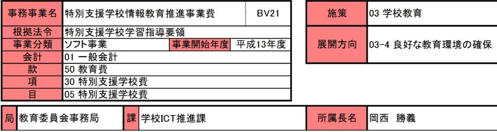 特別支援学校情報教育推進事業費は以前投稿した事務事業評価の内容 令和6年 施策03 【学校教育】小学校情報教育推進事業費や中学校情報教育推進事業費の開始に1年遅れた平成13年度開始の事業です。