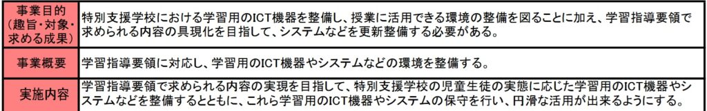 その名前のとおりに特別支援学校を対象にした情報教育推進を行う事業であり、他の情報推進事業と同じく、推進している文部科学省の方針事態が定まっていないことから、現状では事業評価が曖昧であり、情報機器を配布するだけの事業に成り下がっています。
