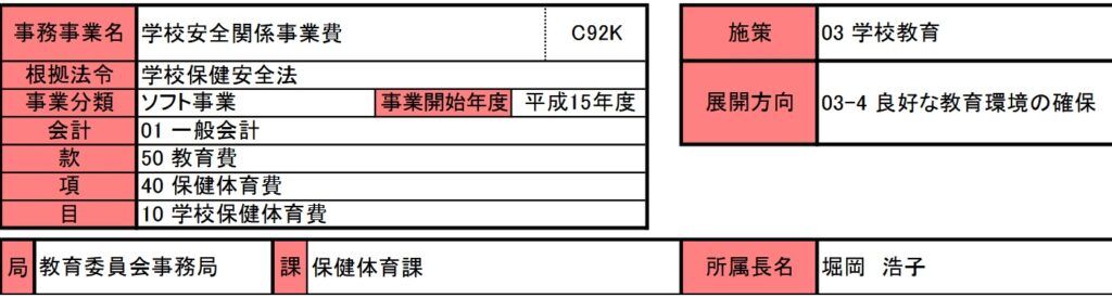 学校安全関係事業費は平成15年度から開始された事業です。これは昭和33年度施行の学校保健安全法に基づいて実施されている事業です。