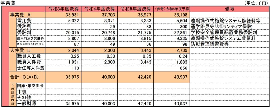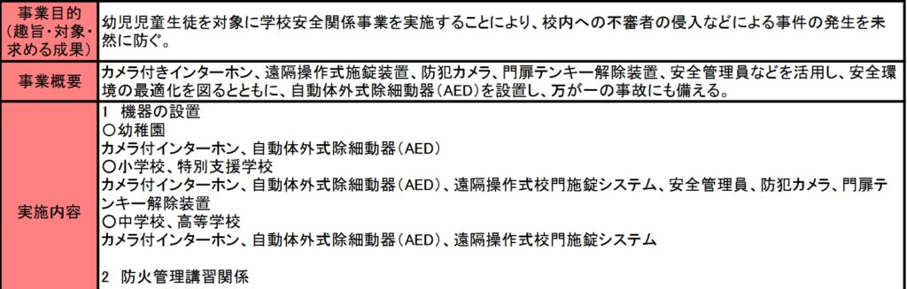 事業の目的には「不審者の侵入など」を未然に防ぐとあり、この事業で考える”安全”が不審者の侵入をを想定した対策を実施していることがわかります。