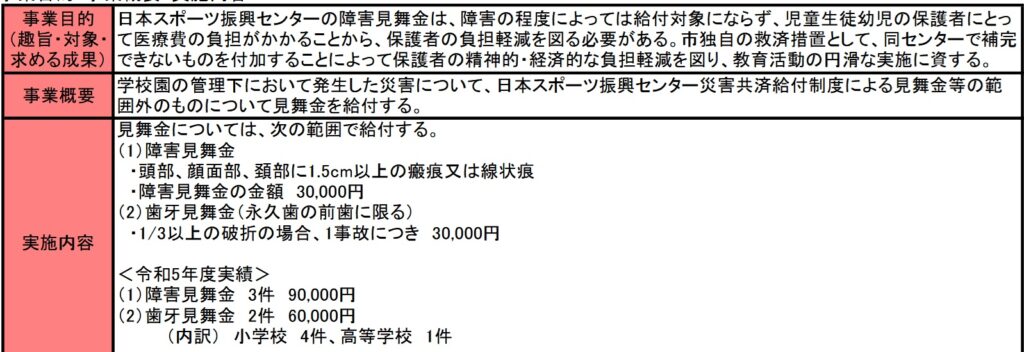 この事業の目的にある、「日本スポーツ振興センターの障害見舞金」とは先ほど書いたこども家庭庁の日本スポーツ振興センター災害共済給付制度のことであり、この制度では見舞金の申請は学校側や保育施設側にあります。