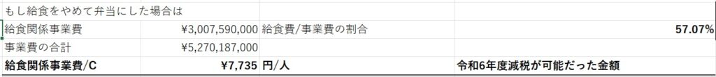 この給食関係の事業費を廃止する=弁当に変えるだけで、上述のように年間7,735円を減税できる計算になります。