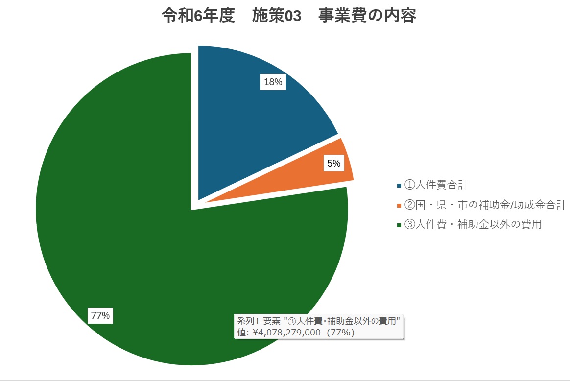まとめ方施策01・施策02の時と同様に、全事業費の総額から人件費・人件費以外の費用・国や市・県からの補助金/助成金の3種類を調べ、それぞれの割合を調べています。そのうち補助金/助成金は国や県・市がバラまいた税金であり、本来であれば国民が支払わなくてよかったはずの税金という考えで、減税が可能であったはずの金額を計算しています。