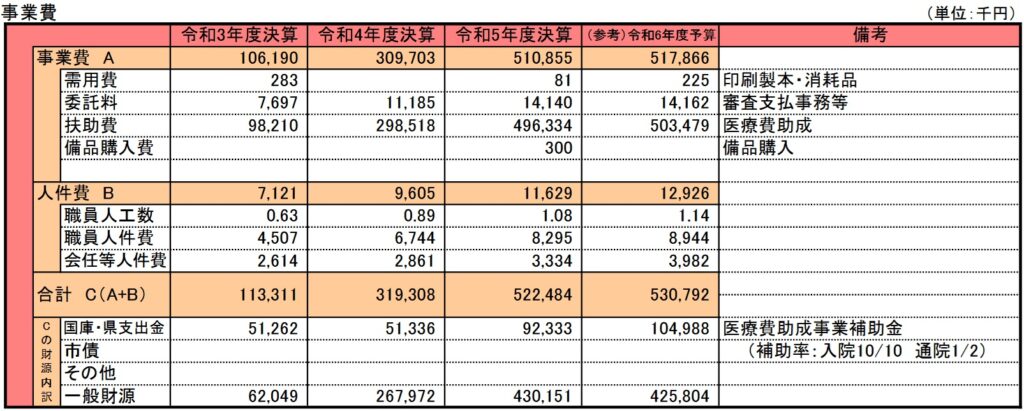 この事業費にも国からの補助金が組込まれており、その金額は令和6年度の事業費全体の約2割です。令和3年度では約5割でしたが、助成金額の増加=受給対象者増加によって、事業費が膨らみ、それに伴い事業費全体に対する補助金の割合が下がっています。