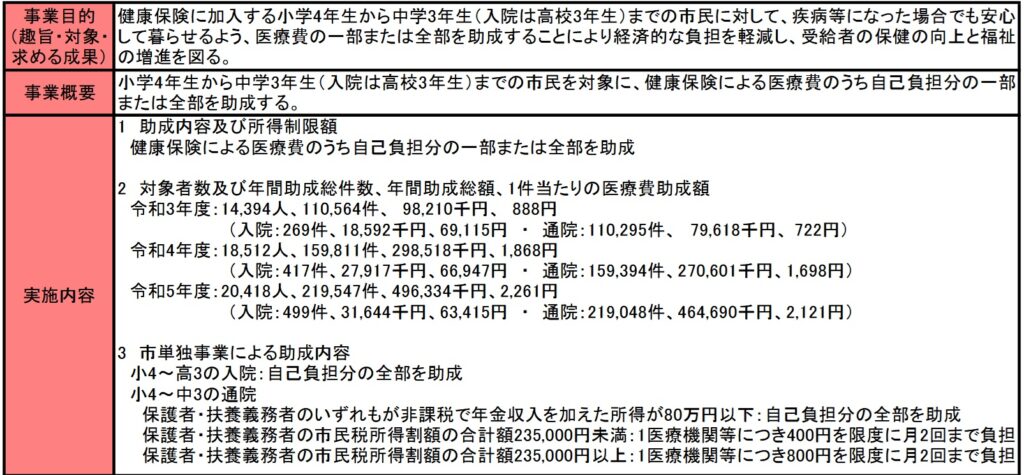 こども医療費助成事業費は平成22年度から開始された事業で、以前投稿した乳幼児等医療費助成事業費が小学3年生までを対象にしたのに対して、この事業では小学4年生~中学3年生(入院は高校3年生)までを対象にした事業です。そしてこの事業も事業費全体の約2割が国からの補助金です。