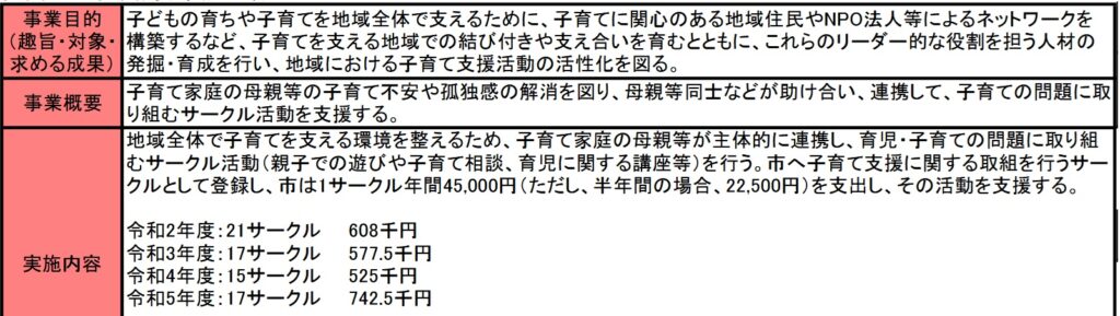 事業成果を見ると、先ほどのサークルの活動内容の格差は認識しているようです。しかも新たな子育て支援制度の開始により、保育施設を利用する家庭がおおくなり、子育てサークルは減少傾向とも記載しています。