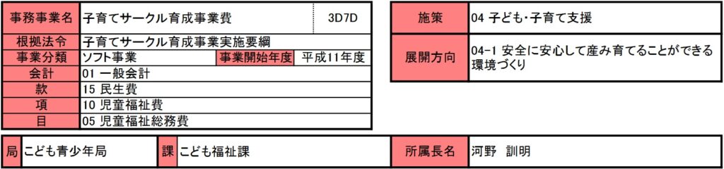 先日投稿した地域社会の子育て機能向上支援事業費が平成22年度開始ですので、その11年前から行われている事業になります。目的にはどちらも同じように”子育て支援”を掲げており、何のために新たに事業を開始したのか、以前からあったこの事業の成果がでなかったからなのか、出ないとしたらなぜ廃止しないのか。