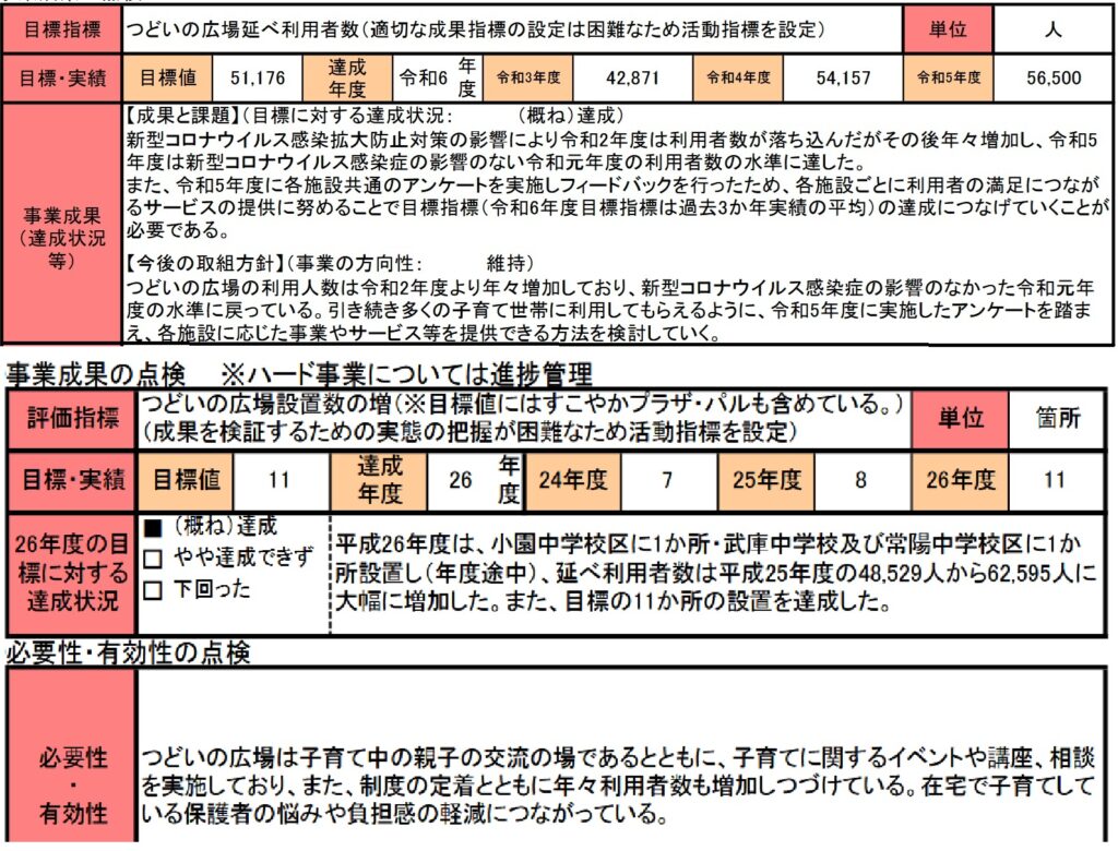 目標指標(平成27年度では評価指標)は令和6年度は、つどいの広場の延べ利用者数を目標にしていますが、平成27年度ではこの、つどいの広場設置数を11か所にするとしています。