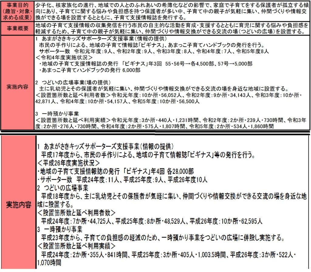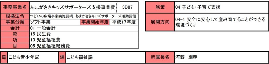 あまがさきキッズサポーターズ支援事業費は平成17年度開始の事業です。子育て支援情報誌「ビギナス」、あまっこ子育てハンドブックの発行を行う事業とありますが、実態は子供たちの一時預かり事業が主な事業費と書かれており、ここでも以前投稿したような事業内容が重複する事業が行われています。