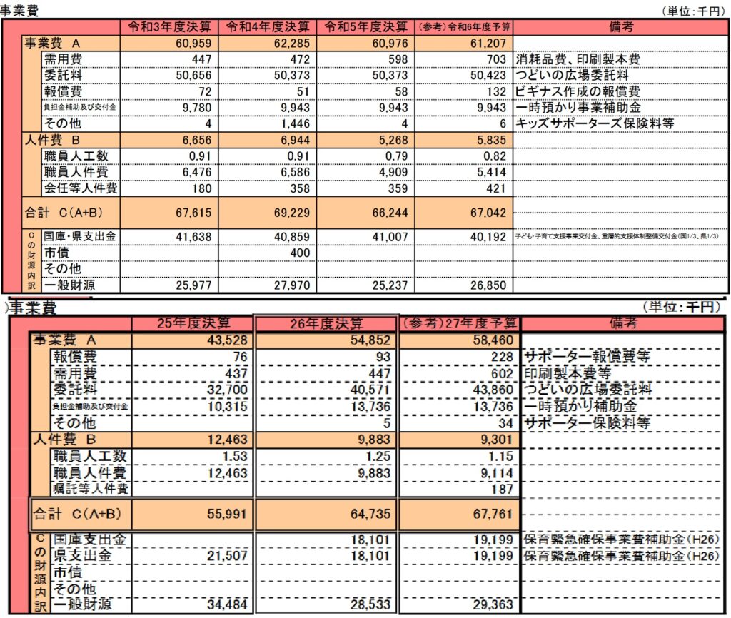 次に事業費も平成27年度のものと比較してみます。平成27年度の時点からこの事業費のほとんどが、つどいの広場委託料と、一時預かり補助費であることがわかります。