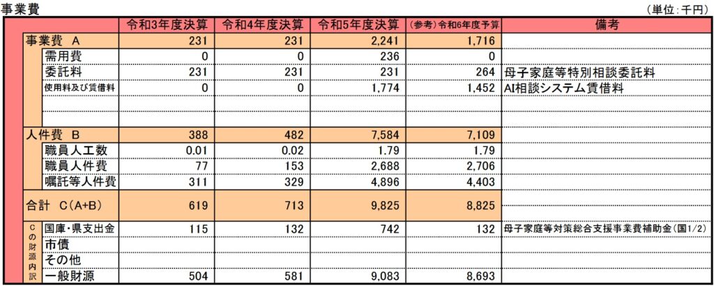 続いて事業費です。令和5年度からAI相談システムを導入して、負担軽減を図ったとありましたが、見事に失敗しています。