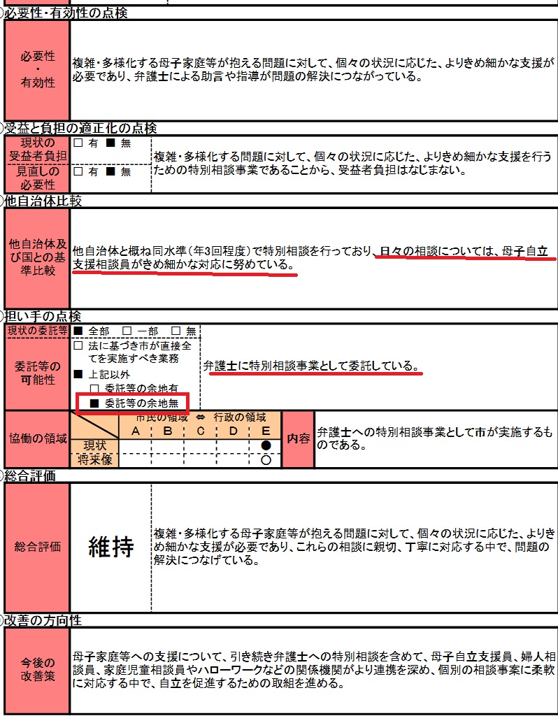 しかもこの事業評価で矛盾するのは、弁護士に委託しておきながら「委託の余地なし」と書いているところです。