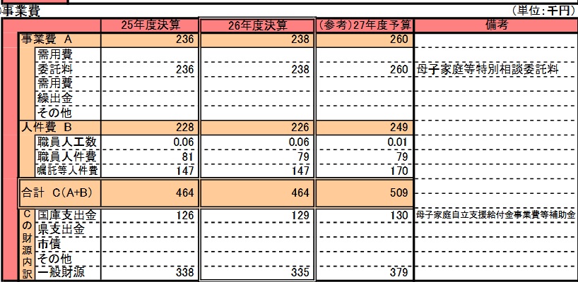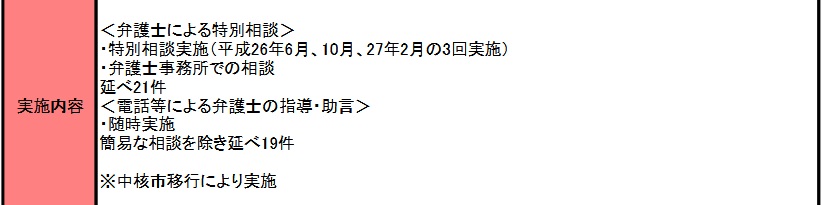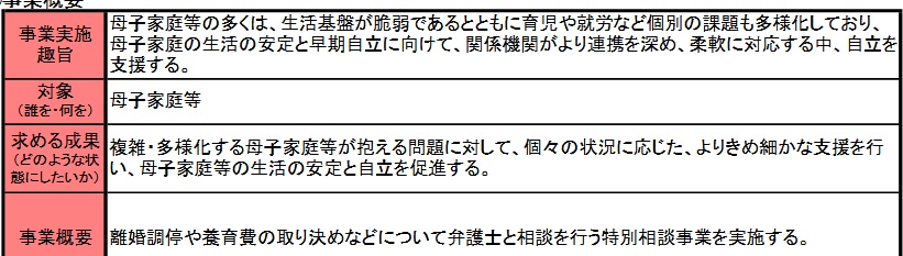 事業成果を確認すると、この事業では相談等は相談員(おそらく母子家庭自立支援相談員)が聞き取った内容を、弁護士に相談している為、その事務処理が負担になってたようです。