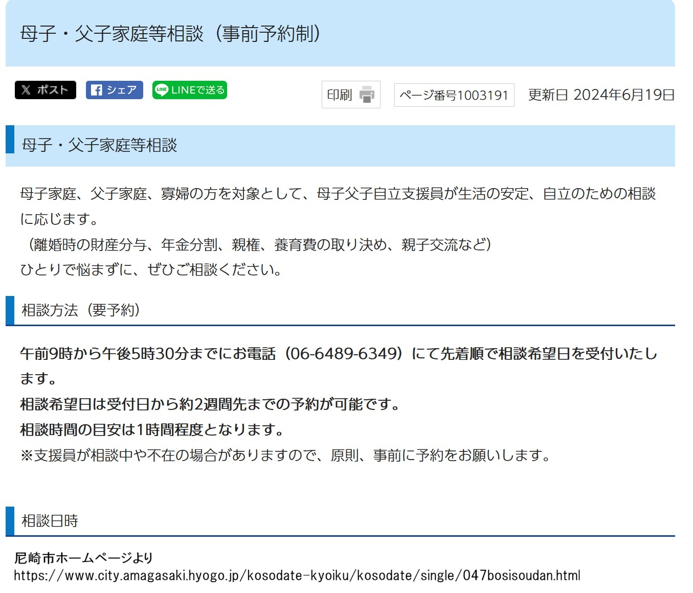 実施尼崎市のホームページから確認すると、母子家庭、父子家庭の相談窓口はありましたが、事前予約制であり、相談時間も1時間と区切られているようです。
