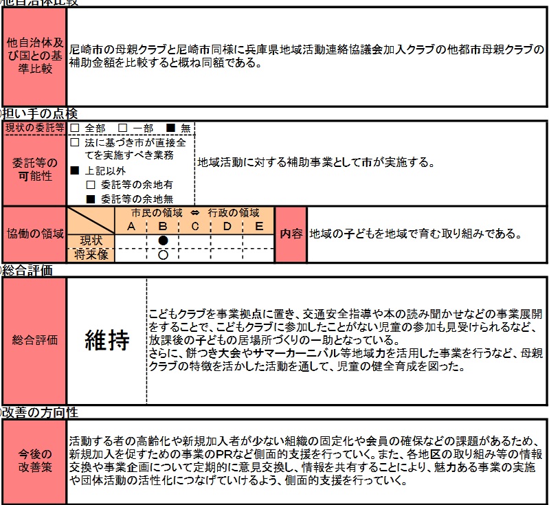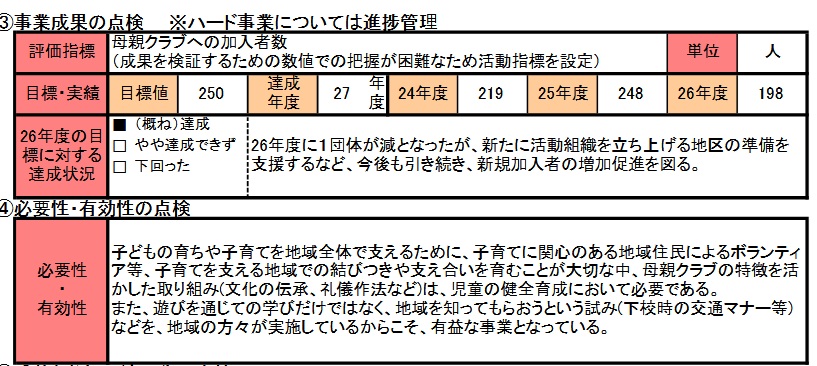 次に事業成果です。尼崎市のホームページにあった4つの母親クラブのうち、1つが高齢化と会員数の減少で、休止したとあります。地域組織の育成が失敗したといっていい事業成果ですが、今後の事業の方向性として、「維持」と書かれています。