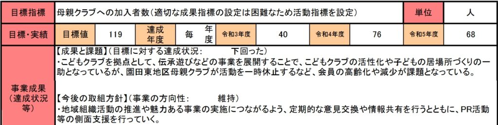 平成26年度では、母親クラブの加入数は198人であったが、令和5年度では半数以下の68人に減少している、「組織育成」事業として、完全に失敗していることがここでも証明されている。