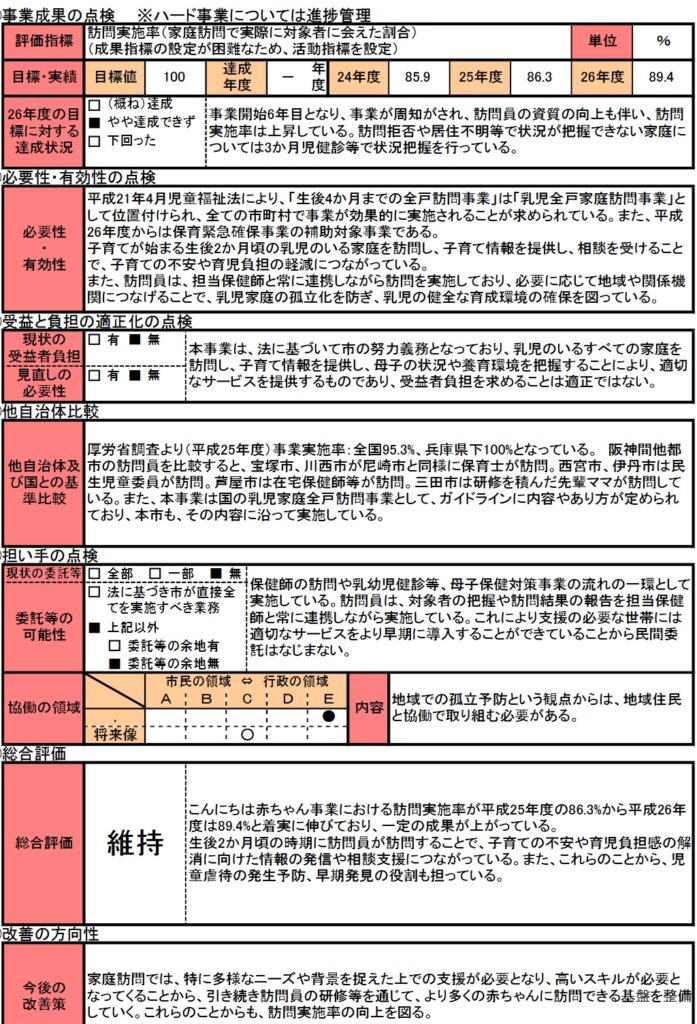 この事業の目的で掲げられた「乳幼児の健全な育児環境の確保」を達成したというのであれば、今のような家庭訪問の実施率などではなく、経済的余裕が家庭に生まれることで、自然と増加する出生数や、虐待件数の減少こそ、目標にするべきです。