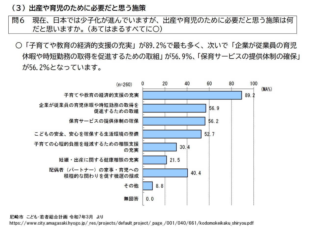 冒頭で掲載したとおり、令和7年3月に尼崎市が独自に調査した結果によると、出産や育児の為に必要だと思う施策では8割以上の方が、「経済的支援の充実」を挙げています。