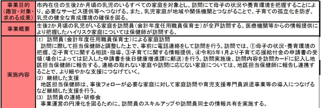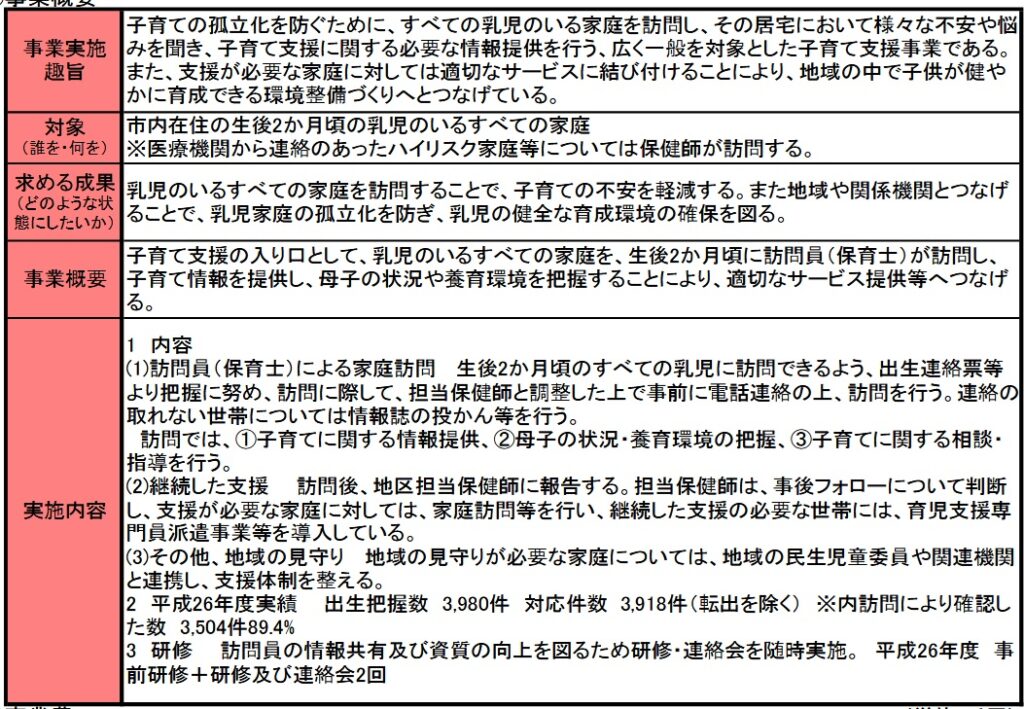事業成果ではほぼすべての家庭(ここでは生後2か月~4か月後の赤ちゃんがいる家庭)への訪問を行うことができており、児童虐待の発生予防、早期発見に寄与した、とあります。