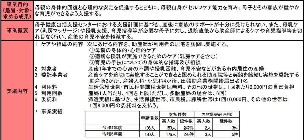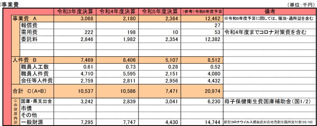 事業費を見ると、事業を開始した令和2年度から令和5年度まで、委託料(産後ケアの費用)よりも、行政費用(職員の人件費等)が2倍以上を占めています。令和6年度でやっと委託料が行政費用を抜きましたが、それでも事業費全体の約半分は行政費用です。