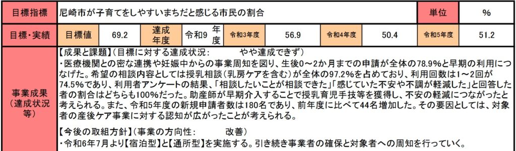 事業成果には、出生数が増えないことを前提としているかのように、顧客(市民)の満足度調査の結果を目標指標にしたとあります。